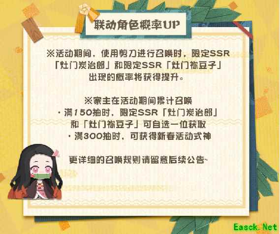 ※活动期间,使用剪刀进行召唤时,限定SSR「灶门炭治郎」和限定SSR「灶门祢豆子」出现的概率将获得提升! ※家主在活动期间累计召唤 ·满150抽,限定SSR「灶门炭治郎」和限定SSR「灶门祢豆子」可自选一位获取; ·满300抽,可获得新春活动式神; 更详细的召唤规则请留意后续公告~ 【灶门兄妹的赠礼】