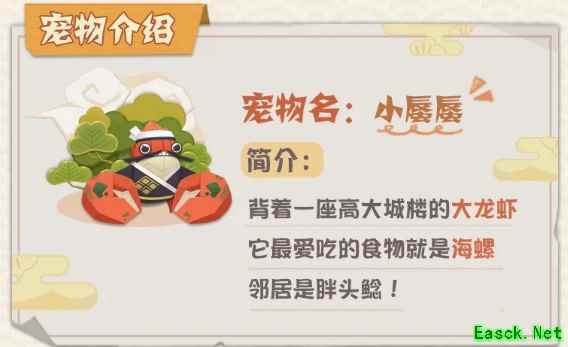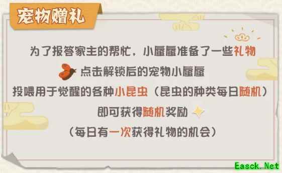 ※上线时间:1月14日 ※获取方式:在庭院最右的石头上找到小蜃蜃,进行剧情对话即可触发收集海螺的任务,收集100个海螺解锁新宠物——小蜃蜃! 【宠物赠礼】 小蜃蜃除了能像其他宠物那样产出木材等资源,还很喜欢吃式神从庭院芦苇丛抓到的觉醒昆虫,每日对其投喂觉醒昆虫能获得随机奖励!