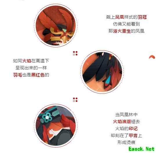 涅槃后的凤凰火身披红黑羽毛,俨然成为一个端庄的御姐,而赤色羽冠代表着她的热血! 【凤凰火·黑焰火羽】