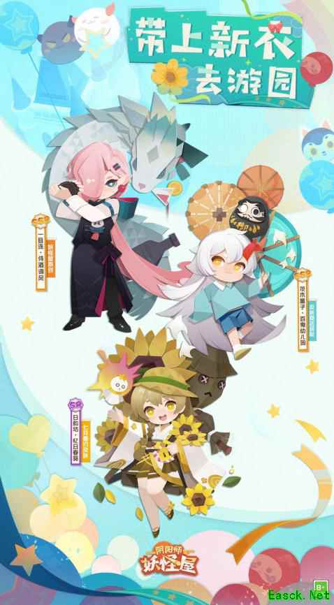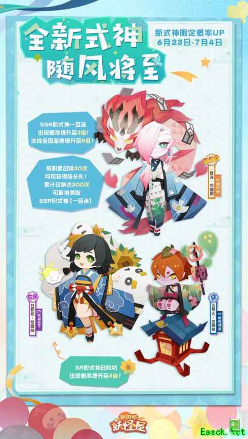 清风拂面,阳光正好 热闹的游乐园中出现了 许多可爱的身影 牵起小手 和小妖怪们一起 畅享夏日游园会吧~ 全新版本将于6月23日开启! 【版本速递】 全新SSR阶式神一目连 携SR阶式神日和坊、R阶式神古笼火入住妖怪屋 新式神召唤概率UP限时开启!
