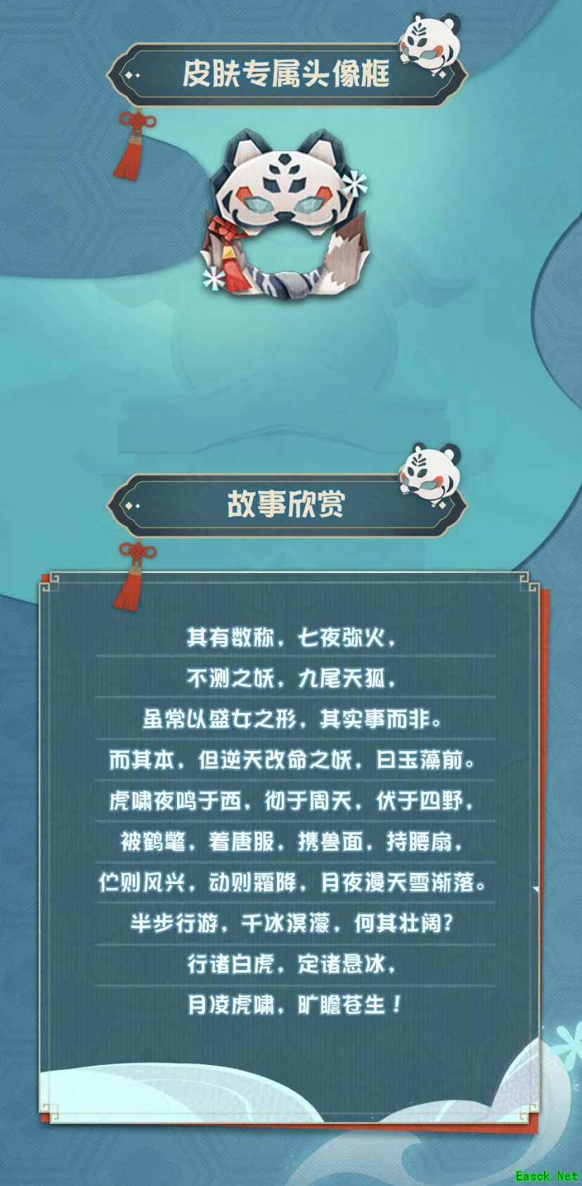 【皮肤获取方式】 「古风雅颂」系列纸韵皮肤 「玉藻前·月凌虎啸」 将于10月13日维护更新后上架皮肤商店 售价120皮肤券 皮肤上架首周可享受限时福利折扣 售价98皮肤券 【纸韵系列皮肤说明】 纸韵皮肤配有专属皮肤彩蛋动作 皮肤专属特效以及静态头像框 皮肤售价为固定价格 与式神本身稀有度无关 【关于《阴阳师:妖怪屋》手游】 阴阳师IP全新休闲养成游戏《阴阳师:妖怪屋》,和风剪纸,Q萌式神,奇妙的庭院里有无限欢乐,小妖怪们正在等你回家! |