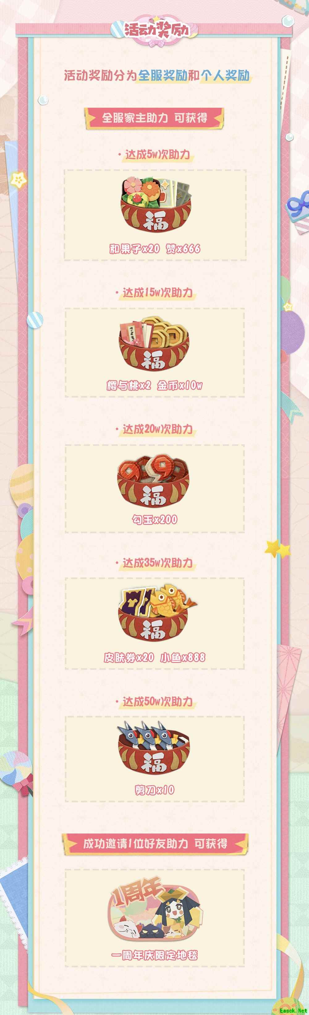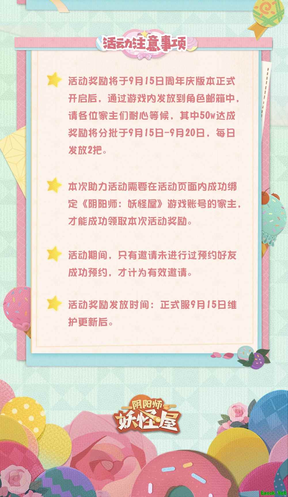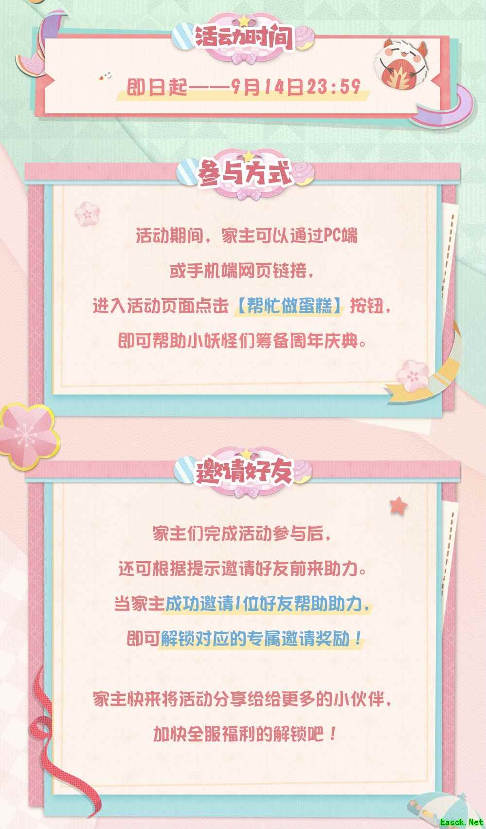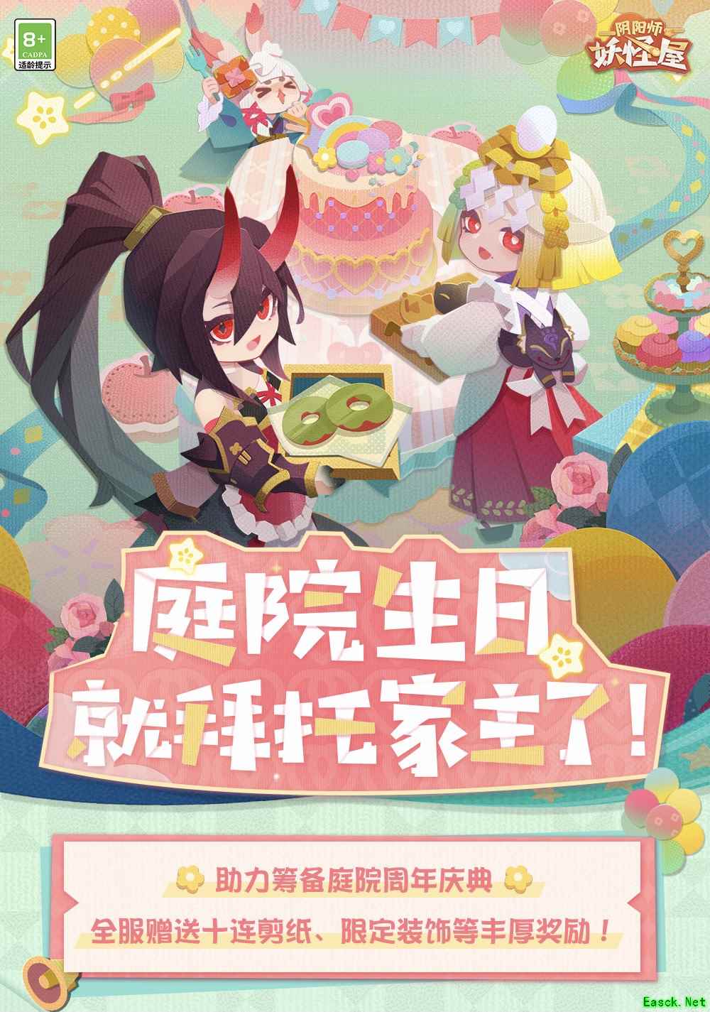 小妖怪们换上了独家定制的新装 美味的甜点与欢乐的气氛将小妖怪们团团围绕 可爱活力双双加倍! 三丽鸥家族传递着无数的温暖 这一次大家又筹备了怎样的惊喜 做好准备 ,派对即将开始~ 期待新朋友到来的同时 也别忘记帮助忙于筹备庆典的小妖怪们! 周年庆典分享助力活动即日开启! 庭院生日就拜托家主啦~