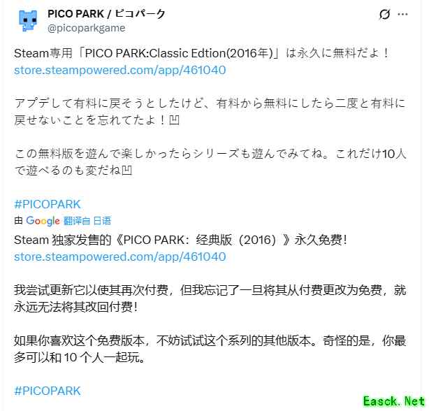 2016年发售的热门多人合作游戏《PICO PARK:经典版》近日宣布,游戏之后将永久免费。 在公告中官方表示,原本只是想举行限时免费活动推广游戏,但没想到Steam平台有条规则,游戏由付费转为免费后,不可以重新恢复付费。这下原本限时免费的活动,变成永久免费更改了。 对于这次操作失误的结果,官方表示希望大家能享受免费的版本,如果觉得喜欢,也可以尝试该系列之后推出的续作《PICO PARK》与《PICO PARK 2》。 |