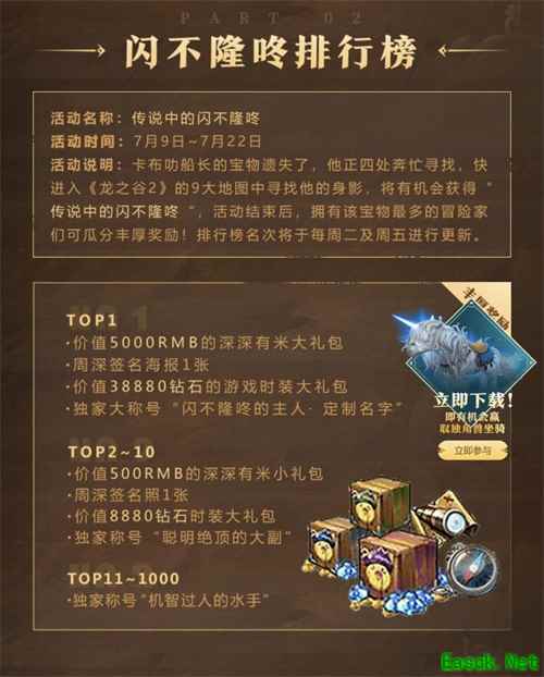 更多精彩福利火热进行中 “传说中的闪不隆咚”活动也在火热进行中。卡布叻船长为寻找宝物“闪不隆咚”向冒险家们寻求帮助,7月9日~7月22日拥有该宝物最多的冒险家可获得价值5000RMB的深深有米大礼包,更有周深签名海报、独家称号等惊喜好礼,TOP11~TOP1000的冒险家也能获得 “机智过人的水手”的称号,冒险家们快进入《龙之谷2》9大地图中寻找遗失的宝物“闪不隆咚”吧! 通过周深直播页下载并进入游戏的冒险家还能获得周深头像框、钻石等船长专属宝藏,冒险家们快点击链接下载游戏获取福利吧~