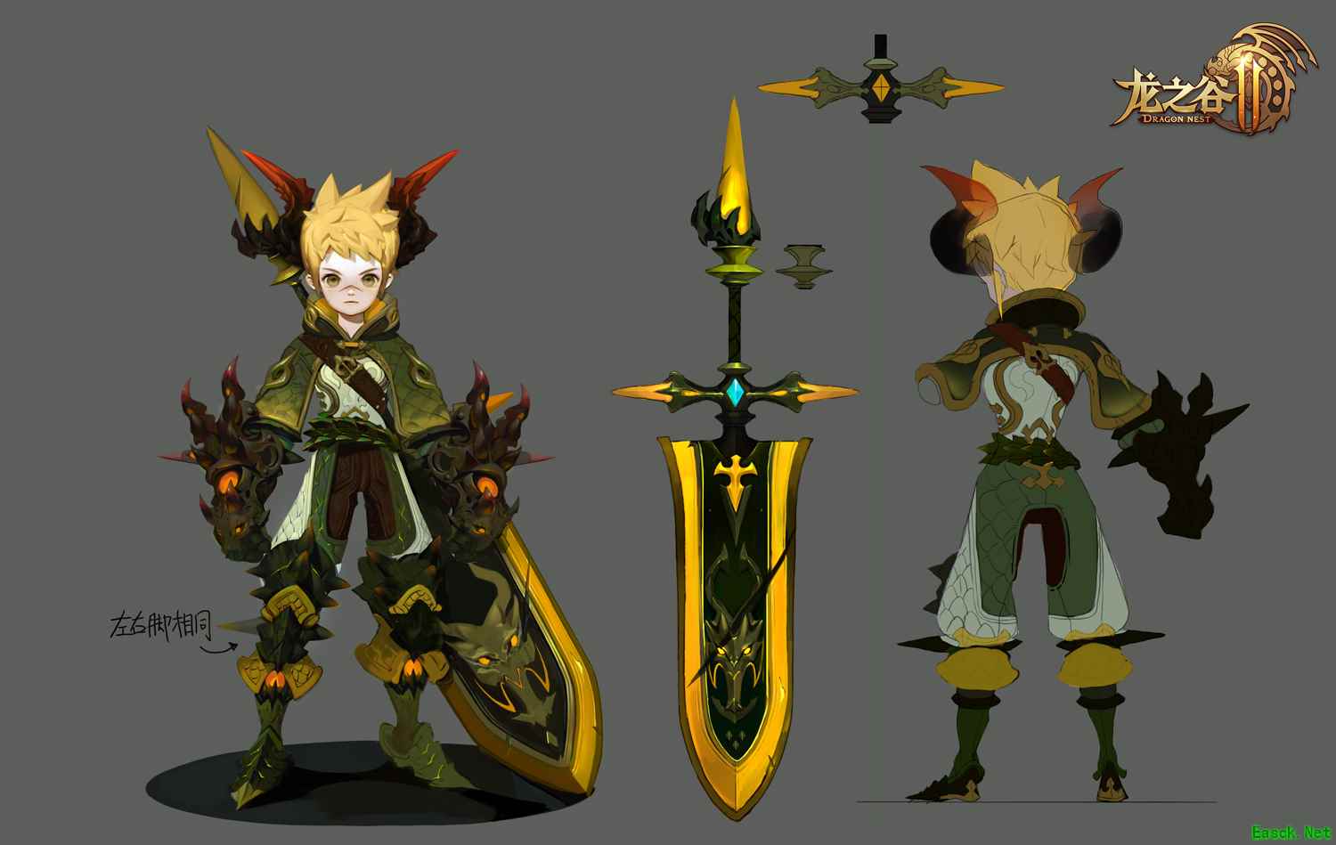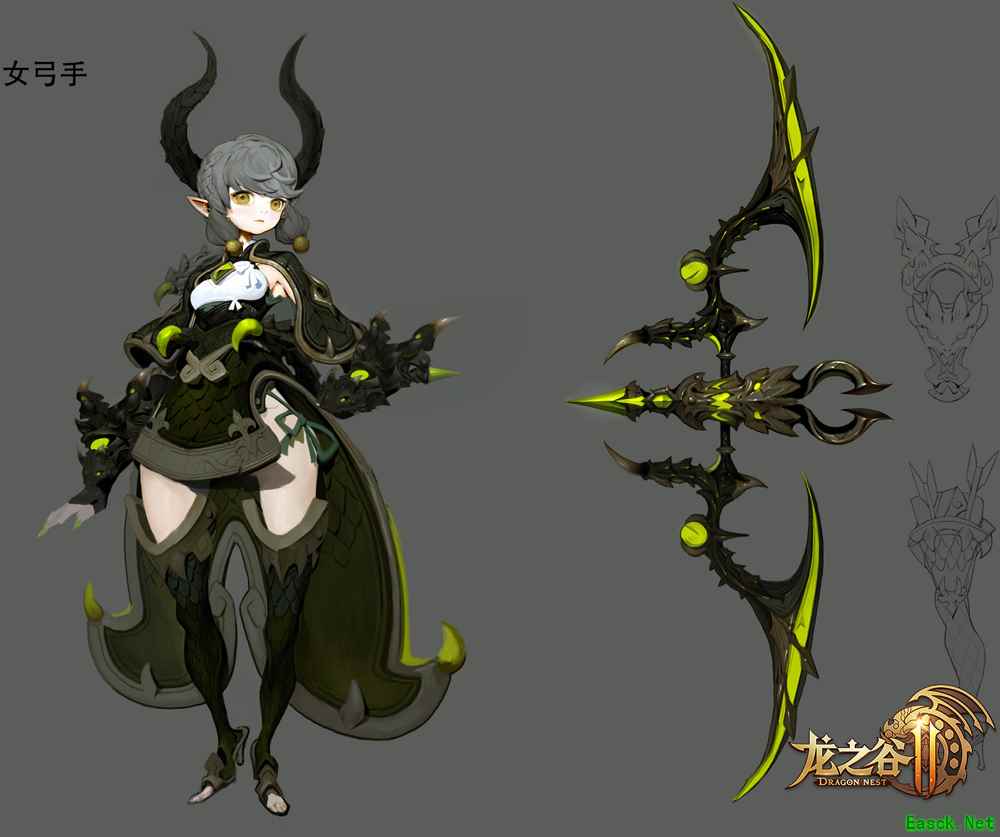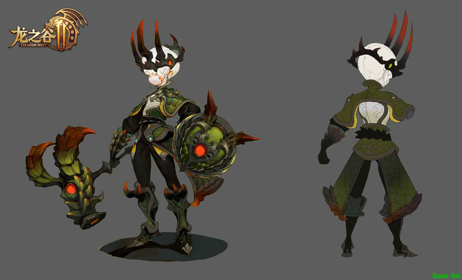 与地狱犬套装所要展现的特征相似,新版绿龙套装中,美术依旧希望能呈现其攻击性。如果说地狱犬套装通过抽象化“犬”的形象,突出某些部位以打造暗黑感,绿龙套装则更加侧重写实。首先,套装上绿龙的鳞片是美术着重设计的细节。而头上的两个龙角,则更是绿龙套攻击性的一个展现窗口,通过由黑到红的一个渐变效果,打造视觉上的一种冲击感。 谷迷们在每个职业的绿龙套装中,都可以感受到美术对高度还原的追求,精确至龙角上的纹理、盔甲上的每一块鳞片,都清晰可见。 黑化绿龙套装 除了正常版本的绿龙套,黑化绿龙套装也是颜值满分!美术在设计的时候,首先考虑的是这么一个问题:同样是龙,怎么突出它“黑化”的特点,和海龙、沙龙等装备区分开呢?而碰巧的是,由“黑化绿龙”这一概念敲定的黑色系与绿色系,刚好与“黑化”无缝契合。