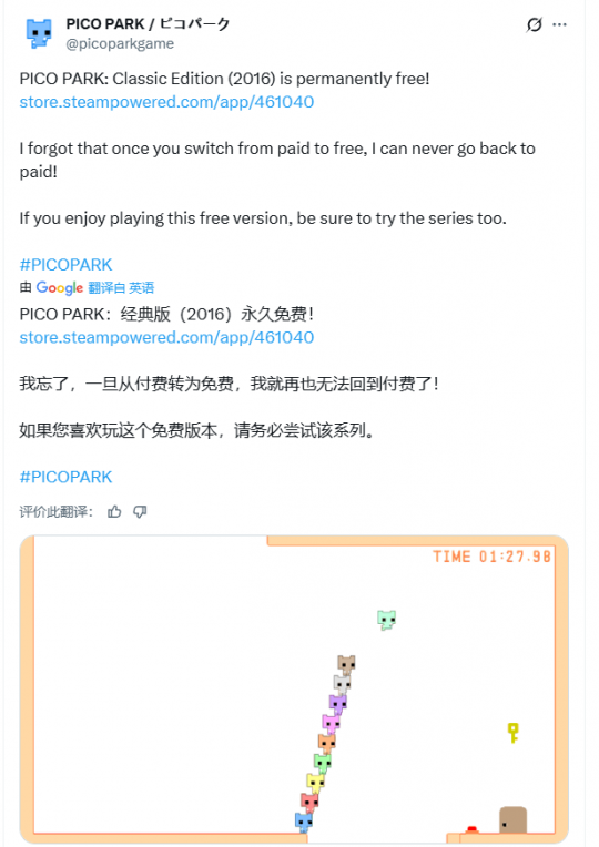 热门合作游戏《Pico Park:经典版》意外永久免费