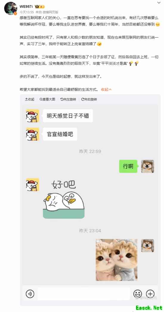 《英雄联盟》职业解说957腿哥宣布结婚!日子让人很意外