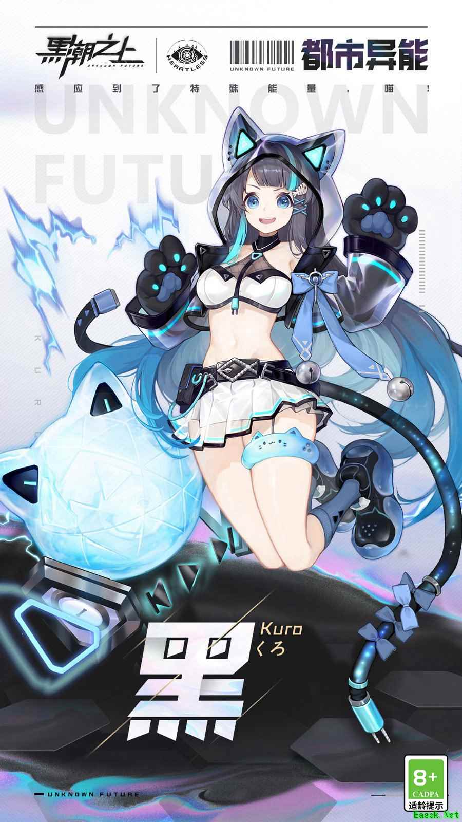 机械猫娘 音波控制!活力黑猫少女高萌登场 「感应到了特殊能量,喵!」 可爱的气息正在接近!猫耳萌动,铃铛作响……《黑潮之上》的少女黑坚持认为自己就是一只真正的黑猫!但普通黑猫可没有这么拉风:又萌又飒的金属猫耳,杀伤力十足的大猫爪,电力满满的插头尾巴,最爱的小鱼干装饰遍布发夹和腰带,再套上连帽镭射透明短装和活力小短裙,一看就是精力爆炸爱耍疯的超级Gamer!为了将黑猫本命贯彻到底,战斗起来自然少不了各种猫界艺能,尖牙利爪,疯狂乱抓……嗯,果然是可爱与实力并存的喵喵大人!