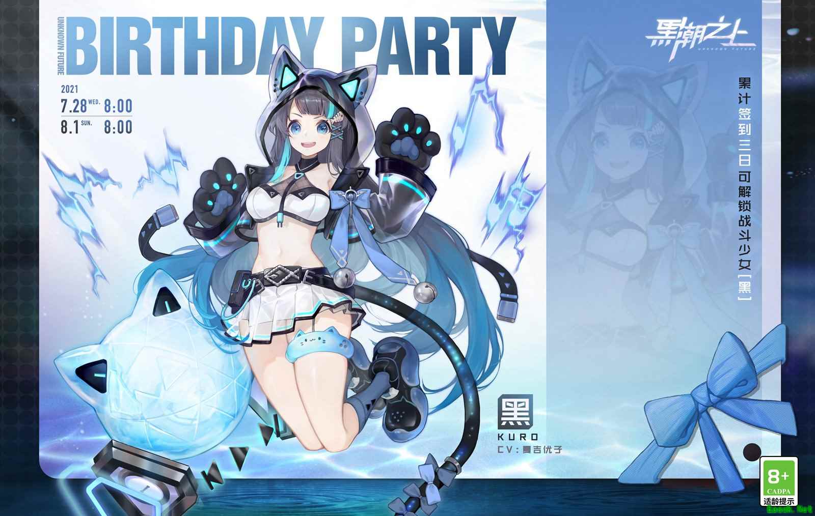 喵喵降临,可爱暴击!7月29日,猫耳少女黑即将迎来她的生日!7月28日至8月1日,《黑潮之上》「机械黑猫」少女黑的生日派对活动限时开启,准时上线签到、为黑庆生,即可免费带走超萌猫娘!是时候喵喵喵喵喵喵,魔物驱散!