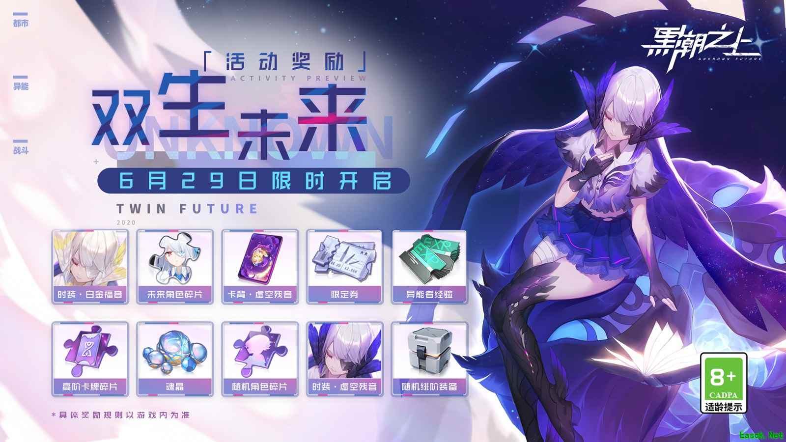 虚空残音,双生未来!6月29日至7月20日,《黑潮之上》惊喜活动「双生未来」限时开启,特别加赠夏日好礼!活动期间,参与活动「虚无的空域」、「双生未来」,就有机会免费领取未来限定时装「虚空残音」、「白金福音」以及限定卡背,更有稀有物资免费送!「夏日花火」奏响前奏,「漆黑咏叹调」正在展卷,这场关于「未来」的博弈,就等你来!