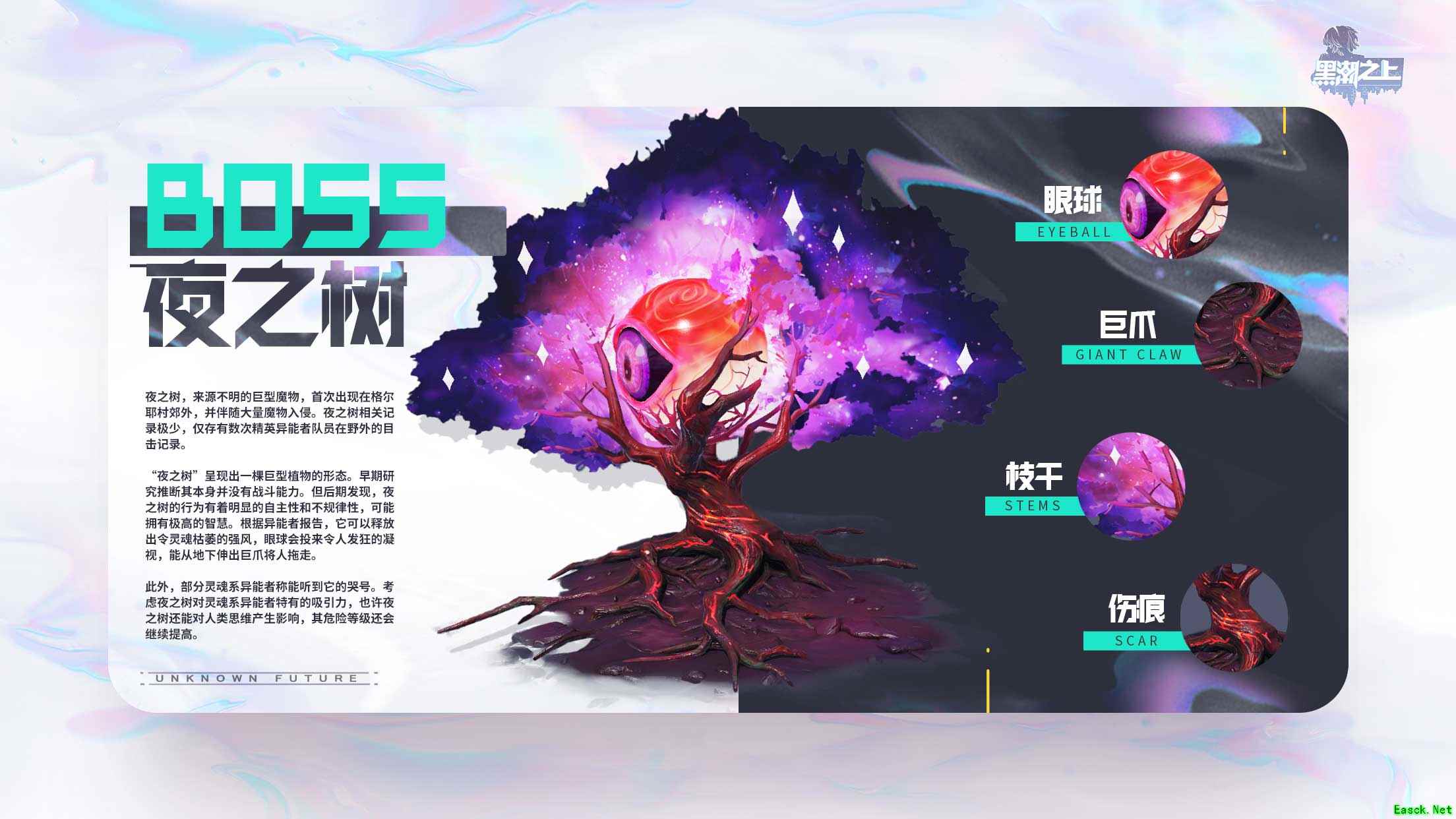 摧毁灵魂的魔物——夜之树 夜之树,一株来源不明的巨型魔物,首次出现的地点就是之前提到的格尔耶村的郊外,它的出现引发了大量魔物入侵格尔耶村的灾难。夜之树相关记录极少,仅存有数次精英异能者队员在野外的目击记录,但都没有造成很大的影响。 与其他动物形态的魔物有着显著不同的是,“夜之树”呈现出一棵巨型植物的形态。早期研究推断其本身并没有战斗能力,危险性是由其吸引魔物的特殊能力所带来的。但后期观察发现,夜之树的行为有着明显的自主性和不规律性,它可能拥有着不亚于人类的智慧。且根据格尔耶村现场的异能者报告,它甚至可以释放出令附近灵魂快速枯萎的灵魂强风,巨树中心的眼球则会投来令人发狂的凝视。现场的部分幸存村民称他们甚至看到了夜之树从地下伸出巨爪将异能者拖走…… 通过收集以上资料,可以给出推断:夜之树本身也极具危险性! 此外,魔物研究中心的安尔研究员指出,她甚至能听到夜之树的哭号。不过,目前研究所内的其他研究员观看录像时,并没有出现类似体验,并推测是她工作劳累产生的幻听。 但考虑到安尔研究员可以听见心声的神奇异能和夜之树对灵魂系异能者特有的吸引力,也许夜之树,还能对人类的思维产生别的影响,其危险等级,或许还会继续提高。 |