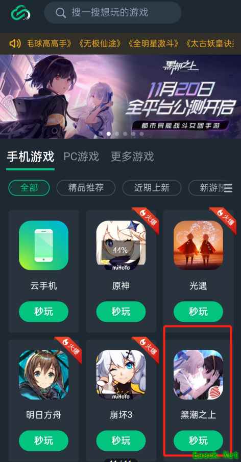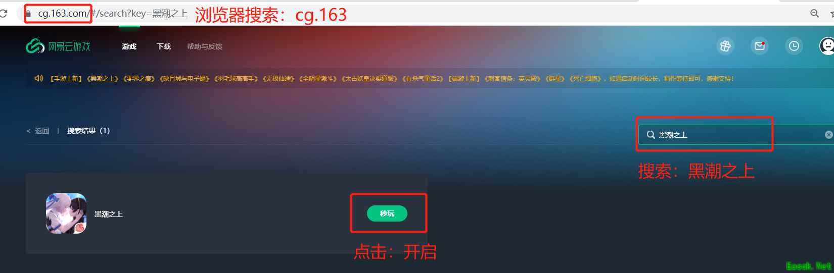 如何在网易云游戏试玩《黑潮之上》: 第一步:手机或电脑浏览器打开网易云游戏的官网(cg.163.com) 第二步:找到《黑潮之上》并点击“秒玩” 第三步:登录后就可以进入游戏 具体图示如下: 端游: