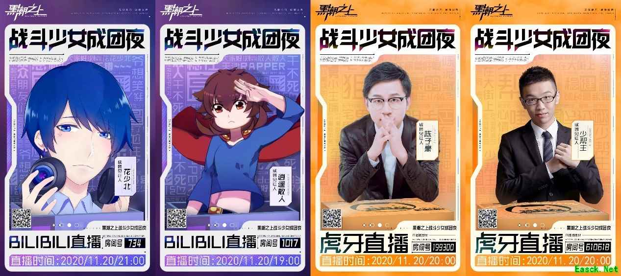 成团盛典,知名主播前来助阵! 作为和战斗女团密切的重要伙伴,在异能少女成团的重要时刻,自然少不了接触者的加入!少女成团夜上,将会出现几位特殊的接触者,他们分别是B站up主逍遥散人、花少北,虎牙主播陈子豪、少帮主。届时他们将作为成团见证人,在11月20日晚19:00——21:00时间段依次开播,见证《黑潮之上》异能少女成团,为她们应援助力!具体的开播时间,敬请点击图片查看!