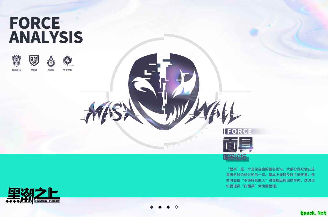 分裂的假面 从解禁的概念图中,我们可以看出,「面具」的标志是一张正在笑的假面,在假面的中间,有一道由于乱码而产生的裂缝,将这张假面分为了两部分:一半完整、华丽,而另一半残缺、狰狞。「面具」的标志向我们传达了这个“势力”的神秘、虚拟,同时,分裂出的两种表情,是否在向大家说明人性的复杂?它究竟是一个怎样的“势力”? 藏匿在面具后的自由论坛 实际上,「面具」并非势力,它是一个言论自由的开放式匿名论坛。与「特鲁西略」、「东方商会」等集团型势力不同的是,只要你愿意,人人都可以参与到「面具」论坛,成为它的一份子,并在此畅所欲言。由于它的保密性和自由性,大部分民众会选择登陆「面具」论坛,匿名在这里讨论想讨论的一切。