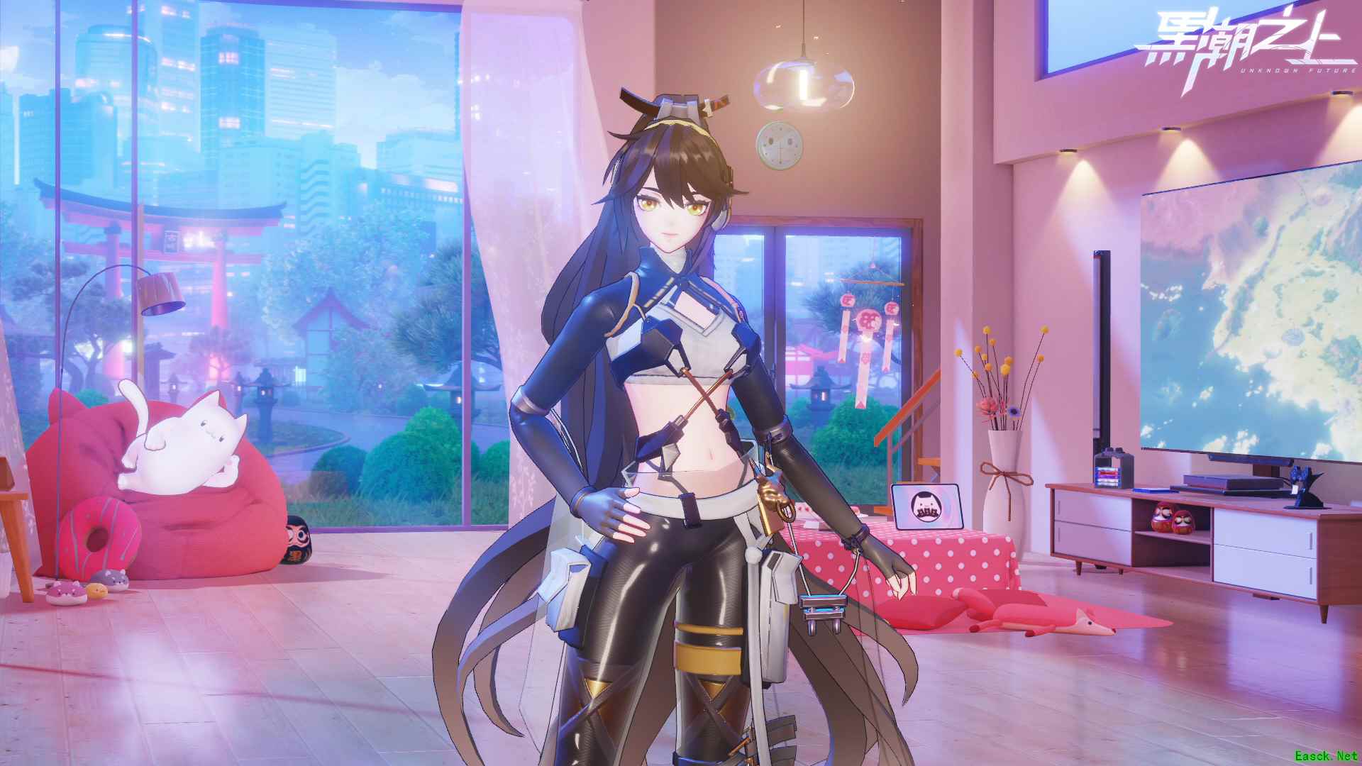 刀舞疾戮!妖刀姬全新时装来袭 当飒爽武姬持刀立于鸟居之上,等闲魍魉不敢靠近半步。 妖刀姬的全新都市风新装「驱傩武姬」,以黑、金黄和银白为主色调的服饰,鲜明的运动风格中暗含东方华韵。为了方便妖刀姬拔刀战斗,这套设计力求简洁明快,金黄色的交叉绑带连接紧身上衣与宽松长裤,中间留白一抹纤细腰线。再戴上“U1小队”特供作战耳机,与异能少女们携手驰骋于都市,挥刀疾戮,将魔物们尽数斩于刀下。