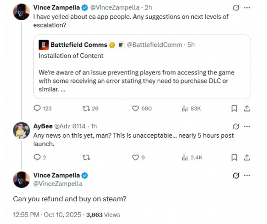 《战地6》老板直接劝玩家放弃EA App:退款买Steam版
