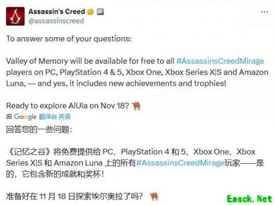 育碧官方今日正式宣布,《刺客信条:幻景》将于11月18日正式上线的免费大型更新“回忆山谷”,将为所有玩家带来全新的成就与奖杯。 据悉,“回忆山谷”DLC将免费提供给所有在PC、PlayStation 4、PlayStation 5、Xbox One、Xbox Series X|S以及Amazon Luna平台拥有《刺客信条:幻景》的玩家。此次更新的核心内容是带领玩家前往一个全新的地区“埃尔奥拉”,并在此展开一段围绕主角巴辛姆的新剧情线。 除了新增的地图和故事,此次更新更注重游戏体验的全面提升。官方透露,更新将包含多项玩法改进与调整,其中包括: 更流畅的跑酷与机动性:对跑酷系统进行优化,使角色的移动更加顺畅自然。 ANIMUS序列任务重玩功能:允许玩家重新体验已完成的特定任务序列,为追求完美或希望回味经典片段的玩家提供了便利。 “回忆山谷”不仅是《刺客信条:幻景》的内容扩展,更是对游戏本体体验的一次重要完善。此次免费更新展现了开发团队对玩家社区的持续支持,备受玩家期待。 |