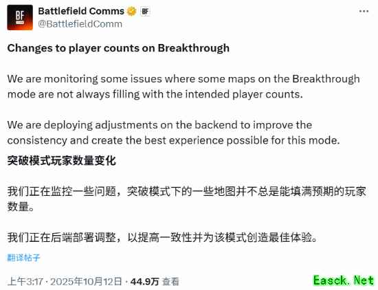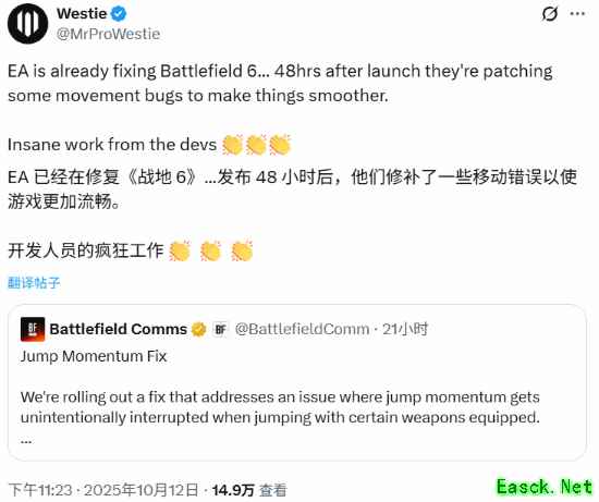 在《战地6》正式发售后的48小时内,EA开发团队已火速推出多轮修复更新,积极回应玩家反馈。首日即解决了游戏内奖励丢失、内容安装异常等问题;次日针对“突破模式”地图玩家数量未达预期的情况进行了后台调整。 首席游戏设计师弗洛里安·勒比汉表示,团队正密切监控武器、移动等核心玩法的玩家反馈,将持续推进优化。 此外,官方积极与社区互动,针对玩家提出的匹配机制及服务器浏览器需求,负责人暗示将逐步推进解决方案。 此次高效更新获得玩家好评,被视为相较前作《战地2042》的更积极开端。 本文由制作发布,未经允许禁止转载。 更多相关资讯请关注:战地6专区 |