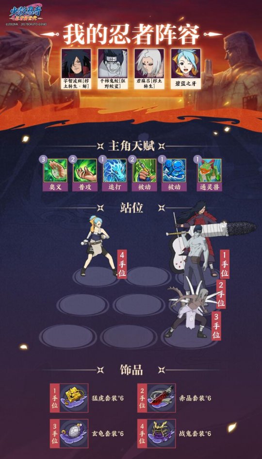 在《火影忍者:忍者新世代》中,攻防特训是不定期推出的活动,玩法是双方自由选择忍者搭配阵容,能定制忍者属性,自行选择先攻或后攻阵营进行对战。 ![]() 一、玩法介绍: 1、开始战斗前只能选择某一阵营进行匹配,会固定匹配到另一个阵营的选手; 2、先攻阵营的选手,在奇数回合时会先出手,在偶数回合则切换为后攻选手先出手; 3、选择后攻阵营的选手,整个对战期间可获得10%的属性加成; 4、该玩法分为普通和死斗模式; 5、普通模式累计失败3次,死斗模式失败1次后,都会结束单次特训; 6、忍具和饰品的效果均会生效。 ![]() 二、属性定制介绍: 1、特训中的忍者使用固定的属性,能自由分配加点值,可根据忍者的特点定制属性的组合; 2、输出能力较强或攻守较为均衡的忍者可考虑选择将忍术或体术的属性提高; 3、具有防守反击能力或功能性的忍者可选择将防御和抗性的属性均衡提高; 4、对同一个属性持续加点,增加的属性值会不断衰减,生命属性每点增加1000点,会衰减20点,其他属性每点增加500点,会衰减10点,请自行合理分配属性值。 ![]() 三、玩法奖励: 1、完成不同的任务后,可获得速之晶石和铜币奖励; 2、在普通模式下,对战胜利1场可获得50勾玉晶石,胜利场次越多,获得数量越高,最高100; 3、在死斗模式下,对战1场可获得75勾玉晶石,最高125; 4、对战失败,均获得10勾玉晶石,每次活动最多获得1000勾玉晶石。 ![]() 四、搭配思路: 1、选择先攻阵营时,可选择4个进攻输出能力都较强的忍者,在第一回合能大幅降低敌方的血线或使其减员; 2、选择先攻阵营时,可选择1-2个具有控制能力的忍者,使用控制型奥义后手控制住敌方的主角或1、2手位的忍者; 3、选择后攻阵营时,可选择2个能保证小队忍者生存的忍者,搭配2个输出能力较强的忍者; 4、选择后攻阵营时,可选择3个自身生存能力较强的忍者,搭配1个输出能力较强的忍者。 五、阵容推荐: 1、阵容一:宇智波斑[秽土转生·解]+君麻吕[秽土转生]+干柿鬼鲛[狂野鲛鲨]+碧蓝之牙 ![]() 2、阵容二:宇智波斑[秽土转生·解]+干柿鬼鲛[狂野鲛鲨]+鸣人[九喇嘛连结]+碧蓝之牙 ![]() 3、阵容三:奈良鹿丸[忍界大战]+佐井[忍界大战]+天天[忍界大战]+疾风舞者 ![]() 六、结语: 运筹帷幄之中,决胜千里之外,如何运用自己所拥有的忍者,是一件值得深思熟虑的事。欢迎各位忍者学员来《火影忍者:忍者新世代》中尝试不同阵容的搭配和对战思路,我们在这等着你! |