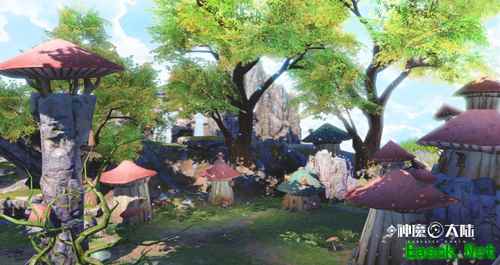 凯旋平原特色的蘑菇屋 在服饰铠甲上。人物服饰设计参考《文艺复兴三部曲》中讲述的14~16世纪欧洲文艺复兴阶段的社会文化背景、艺术发展流变。比如14世纪透明薄纱织品属于当时流行款式,狮心骑士团对牧师和法师这类对元素感知需求很大的职业会大量采用此种设计,并会借鉴当时的流行的服饰设计元素,再如高阶战士的盔甲以金箔镶边为主,护肩采用狮心骑士团的纹饰——雄狮。