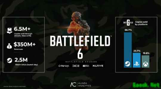 根据数据分析公司Alinea Analytics的最新报告,《战地6》在正式发售四天多的时间内,全球销量已突破650万份,创收约3.5亿美元。该作在Steam平台的并发玩家数曾达到74万,目前PC玩家占比高达57%,成为该作的主力用户群体。