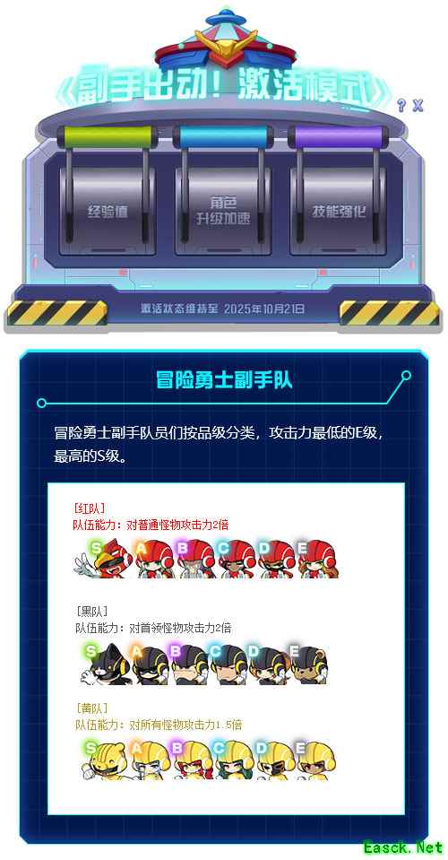 经典端游《冒险岛》每年10月的保留节目——夜晚的马戏团又双叒来啦!这次休彼得蔓大手一挥,赞助地球防御本部一起举办庆典活动~不仅内容有趣,奖励也极其丰厚!还有万圣节专属的次元鬼屋任务和我的小屋(万圣节版)等你来参加哦~ 夜晚的地球防御本部庆典,冒险岛金刚S横空出世?! 10月15日起至11月25日,玩家可参与[夜晚的马戏团]夜晚的地球防御本部庆典任务,活动期间,休彼德蔓组建了冒险勇士副手队,不同颜色的队伍能力各异,消灭等级范围内怪物收集冒险勇士点数,支援冒险勇士的队员们吧。 每周要激活出动模式、设置获得奖励的模式(三选一),选择后该周无法更改。奖励每日最多领取1次,每周最多领取3次。 除主要活动之外,玩家们还将化身庆典设计师,设计师拥有装备庆典的力量,通过使用幻想币来强化冒险岛金刚S或装饰各种庆典饰品。 庆典设计师分为5个等级,达到后,获得的设计师经验值全部兑换成幻想币,可通过休彼德拉获得。 冒险岛金刚S有2种专利许可技能,冒险岛金刚S:炼狱轰击技能与冒险岛金刚S:制空强击技能。构成冒险岛金刚S的部位共10种,各个部位都会帮助发动冒险岛金刚S的专利许可技能。最先激活头部和面具部位才能使其他部位准备驱动,进入可激活状态。头部部位激活后,胸部、腰部、左手拳和右手拳都会变成可激活的准备状态。面具部位激活后,左侧肩膀、右侧肩膀、左侧手臂、右侧手臂都会变成可激活的准备状态。各部位不同强化阶段的可分为0阶段、1阶段、3阶段、5阶段。 使用幻想币强化冒险岛金刚S,或装饰各种庆典饰品后,可以获得增益。 部分增益奖励需要在地球防御本部庆典现场找NPC淘气白外星人领取。 庆典小游戏一——升起的明星阿琳举办粉丝见面会 即日起至11月25日,参加[夜晚的马戏团]升起的明星阿琳举办粉丝见面会!活动,获得 阿琳的粉丝见面会普通席入场券,双击使用进入到粉丝见面演唱会现场,遇到粉丝俱乐部外星本部的应援团长白外星人,获得专门为阿琳研究WOTA艺,只要跟着做就能获得奖励! 在阿琳的粉丝见面会场地普通席与VIP席都可以购买纪念道具。 庆典小游戏二——虚拟训练系统启动! 即日起至11月25日,参加[夜晚的马戏团]虚拟训练系统启动!活动,休彼德蔓为了应对敌人入侵地球防御本部的庆典现场,进行虚拟系统训练,进入系统后,会随机指引击败目标。个人能够持有的激光弹夹和子弹有限,成功发射时发放分数,如向目标之外的对象发射,则回收分数。没有弹药或剩余时间时,将自动退出。获得的分数可以兑换成设计师经验值。 累积分数达到10000分时,可以获得虚拟训练大师椅子交换券。 庆典小游戏三——监视要员阿亮 10月29日起至11月25日,参加[夜晚的马戏团]监视要员阿亮活动,成为庆典现场的监视要员,抓出可疑人员,可疑人员进入瞄准器后保持2秒不离开范围,就会出现数值条,数值条填满的瞬间,特殊开发的驱除器启动,发射电波立即清除可疑人员。获得的分数可以兑换成设计师经验值。 累积分数达到20000分时,可以获得锁定目标!椅子交换券。 庆典小游戏四——冒险岛金刚S超频 10月29日起至11月25日,参加[夜晚的马戏团]冒险岛金刚S超频活动,消灭等级范围内怪物,收集补充能量的浓缩能量和急速冷却上涌热气的液氮,可以对冒险岛金刚S进行超频作业,升级冒险岛金刚S的炼狱轰击与制空强击技能的额外属性。 庆典小游戏五——守护庆典 10月29日起至11月25日,参加[夜晚的马戏团]阿哲的紧急呼叫活动,维护庆典现场的和平,消灭卡雄战甲吹泡泡鱼模式怪物,限时期间内通过对怪物造成的伤害获取分数,根据分数发放对应的经验值。*超过第10阶段,进入挑战极限的领域,消灭怪物后获得突破极限分数。 突破极限分数达到1000分,还能获得我们是冒险勇士!椅子交换券。 庆典小游戏六——练习胜利姿势 11月12日起至11月25日,参加[夜晚的马戏团]练习胜利姿势活动,阿海构思了让人记住冒险勇士存在的帅气姿势,跟着录像练习,点击对应的方向键完成胜利姿势,获得的分数可以兑换成设计师经验值。 累积分数达到20000分,还能获得有些奇怪的冒险勇士椅子交换券。 庆典小游戏七——介绍一下机器人朋友 11月12日起至11月25日,参加[夜晚的马戏团]怪物外星人章鱼枪和机器人朋友活动,帮助怪物外星章鱼枪和机器人朋友顺利定居地球防御本部。作为回报,每天可以从机器人朋友处获得一个随机礼物。快来试试今日运势如何吧! 装备附加属性传授: 马戏团特殊福利: 即日起至11月25日,随着活动的展开,每当设计师等级上升时,依次开放1个福利按钮,等级升级为大师级,可预约激活冒险岛金刚S项目纪念模式!在马戏团庆典结束2周内可以继续使用冒险岛金刚S技能。 完成隐藏任务可以获得:地球防御本部庆典照片卡。 超越成长秘药: 密特拉的极限能量石500万100%箱: 密特拉的星之力强化箱: 装备传授: 移动骑宠技能: 寻找异常!解决鬼屋的次元扭曲吧! 10月22日起至11月4日,玩家可参加次元鬼屋活动,受到次元门开启事件影响,鬼屋的次元扭曲了,寻找异常现象,解决鬼屋的次元扭曲,累积每日稳定化次数,获取各种奖励吧! 顺利逃出次元鬼屋,可以累积1次每日稳定化次数(每天仅可累积1次每日稳定化次数)。根据每日稳定化次数,可获得以下奖励。 万圣节专属我的小屋~今年依旧要保持惊悚可怕哟~ 10月18日起至10月31日,玩家可在我的
