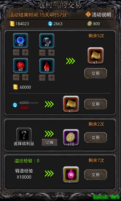 在新版本地图中,城主们将会获得特殊道具。只要使用道具,就可以将仓库中特定唯一装备成功升星!今后装备升星将不仅限于蓝图自制装备,城主们曾经在地图探索途中获得的特定唯一装备,将不再随着城主们战力提升而留在仓库吃灰,也能升星为更强大的装备,重新获得上场机会! 不过本次仅「尤尔魔戒」和「暴君铠甲」支持升星,其他特定唯一装备的升星,将在后续版本中陆续开放。 如果城主在幻境商人装备找回功能上线前,已经将支持升星的这2件装备分解了,也不必担心。幻境商人已经为此做过专门升级,只要找他就能直接顺利找回历史分解丢失的这2件装备! 福利活动——寇柯兰的交易限时回归 (研发环境中截图,以游戏内实际为准)