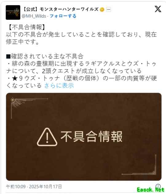 卡普空今天宣布,已经确认了《怪物猎人:荒野》 多个最新问题,新的更新补丁将于本月发布,敬请期待。
