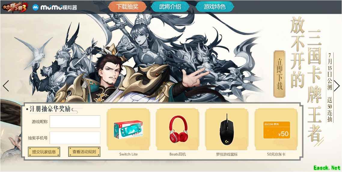 MuMu下载赢好礼 switch等大奖等你来拿 在游戏公测期间,网易MuMu模拟器与《放开那三国3》联手推出福利活动,7月15日至7月22日,在MuMu模拟器应用中心,下载注册游戏的玩家,将有机会抽Switch、Best耳机、罗技鼠标等好礼哦,大家不要错过机会了。