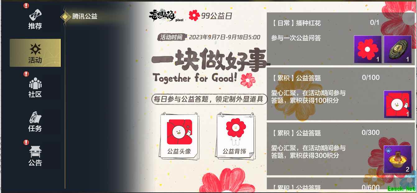 妄想山海×99公益日活动界面 活动奖励: 1、日常任务:每日参与一次公益问答——小红花*1、悬赏令*1。 2、累积任务:完成公益问答获得活动积分,累积可获得——【头像:小红花】、山海一锅出*2、鹞灿石*1、小红花背饰、化育丹*6、红品·纳芥御弩*1。 3、全服任务:全服累计获得50万小红花,腾讯公益将资助百名乡村学生游览"2023黄河非遗大展”!
