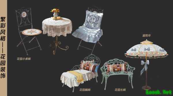 此次更新后,繁彩风格新材质、新结构、新壁画、新家具也将一起上线! 1)全新风格建材结构:童话风格的材质——繁彩结构可在【息壤-异筑】中解锁。新增了多达105种不同风格的建材建构,包含天窗、尖顶、层叠的小屋檐、琉璃顶、小烟囱等各种建构类型; 2)墙壁内外两面壁画:新增的墙体还将带有内外结构的区别,不仅墙壁两面设计完全不同,旅者还可以利用壁纸对墙体两面进行精细化设计!繁彩壁画需要在织布机制作,需要材料椰油、精良布料、绛云露;