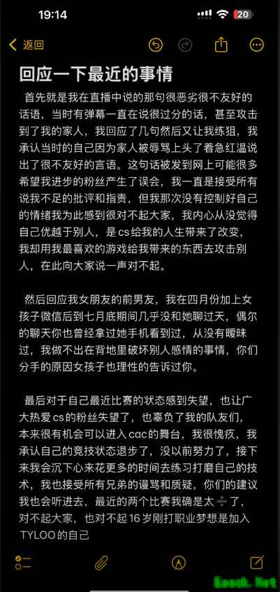 《反恐精英2》中国战队TYLOO在今年7月的裂变天地S1赛事中创造历史,夺得队史首个国际赛事冠军。原本这被视为天禄崛起的开端,但此后的战绩却不尽如人意:不仅在裂变天地S2未能成功卫冕,又先后在IEM科隆、电竞世界杯、CAC大赛中早早出局。而近日,队伍主狙选手JEE因表现欠佳、直播中的激进言论及个人生活作风问题,引发舆论热议。 在此前的直播中,部分观众弹幕质疑JEE的竞技状态,嘲讽道:“你想想把你的破狙好好练练吧,孩子。”对此,JEE直接回怼:“你先想想怎么赚得有我多吧,行吗大哥?” 这番回应被不少网友批评“情商低”“毫无职业素养”,认为他既没有亮眼成绩,也不应表现出优越感。 面对争议,JEE于昨日在社交媒体上发布公开道歉信,表示自己在直播中确实说出了不当言论: “首先,我在直播中说的那句很恶劣、很不友好的话,是因为当时弹幕有人不断说过分的话,甚至辱骂我的家人,我才情绪失控、上头回应。那句话被发到网上,可能让很多真心希望我进步的粉丝误会了我。我一直都接受批评和指责,但那次没控制好自己的情绪,为此我向大家道歉。我从没觉得自己比别人优越,是《CS》改变了我的人生,而我却因为冲动,用这款让我热爱的游戏带来的荣誉去伤害别人,对不起大家。” 此外,JEE还回应了“抢自己观众老板女朋友”的传闻,称这是误会。 本文由制作发布,未经允许禁止转载。 |