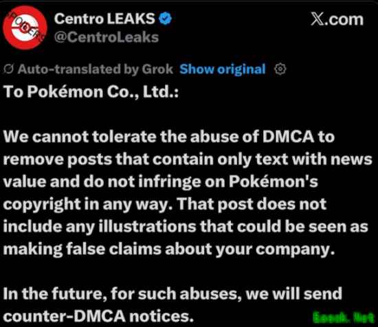 近期,《宝可梦》系列遭遇“史上最大规模泄露”,大量机密信息曝光,包括第十世代及未来计划的细节。部分泄露内容还提到,《宝可梦传说:Z-A》的开发预算约为20亿日元(约合1300万美元)。 如果你对上述泄露内容还抱有怀疑,那么宝可梦公司首席运营官(COO)Takato Utsunomiya亲自要求删除这些信息,几乎是最有力的证明。 目前,推主Centro LEAKS是社交媒体上宝可梦泄露信息的主要来源之一,该账号曾在《宝可梦传说ZA》上线前发布多条泄露信息,也常提供《宝可梦口袋》及其他相关媒体的泄露内容。 10月16日,该博主报告称,宝可梦公司已直接联系了他们:“宝可梦公司首席运营官Takato Utsunomiya已亲自通过邮件联系 我们的账号,要求删除宝可梦泄露图片。” 然而,Centro LEAKS重申不会删除任何泄露内容或图片。博主还进一步确认,其中包括《宝可梦Wave/ 宝可梦Wind》疑似官方标志的图片也在要求删除之列。 不仅如此,Centro LEAKS还强硬反击宝可梦公司:“我们无法容忍贵方滥用DMCA法案,删除那些仅包含具有新闻价值的文本、且完全不构成对宝可梦版权侵权的帖子。该帖子并未包含任何可能被视为对贵公司进行不实指控的图片。对于未来此类滥用行为,我们将提交反DMCA通知。”此外,他还调侃称拉丁美洲是世界上唯一一个任天堂没有获胜的地方,因此不惧怕任天堂法务部。 本文由制作发布,未经允许禁止转载。 |