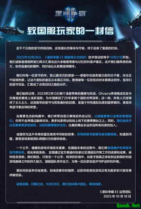 今日,《星际争霸》官方微博宣布《星际争霸2》国服将回归!10月19日开放游戏预下载,10月21日开启技术测试,10月28日正式回归,一起来看下。