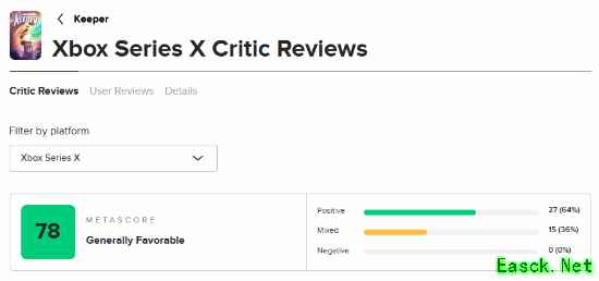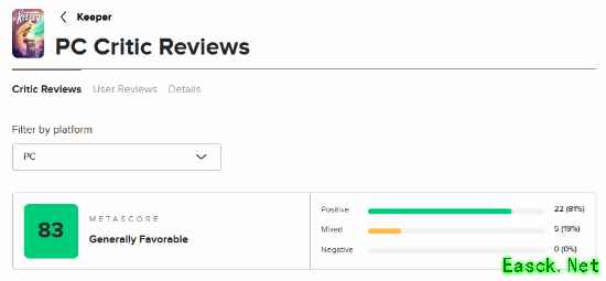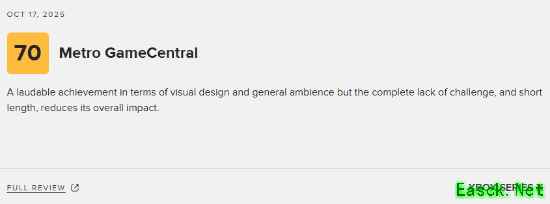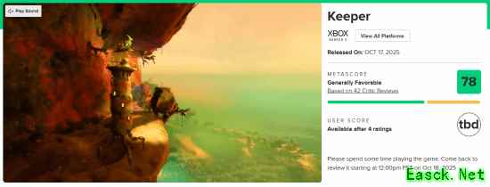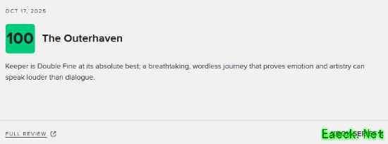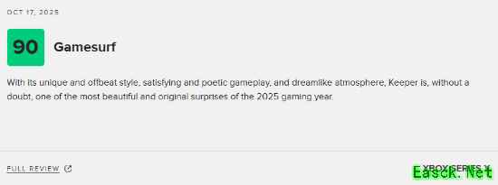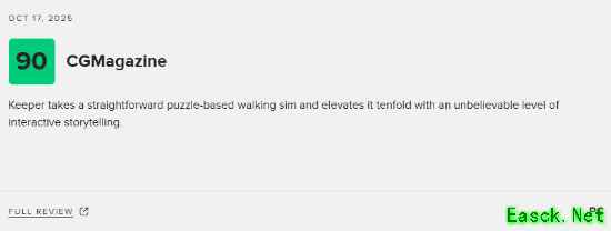 由《脑航员》制作组Double Fine制作、Xbox Game Studios发行的冒险新游《Keeper》现已正式发售,《Keeper》是一场唯美而超现实的异界冒险,也是一部无需言语诉说的动人故事。 目前游戏的M站媒体评分已经解禁,截至发稿前,共有44家媒体对本作进行评测,媒体均分为78分(本文会针对评分情况持续更新),其中Xbox Series X平台的评分为78分,PC平台的评分为83分。 点击查看MetaCritic实时评分>>> The Outerhaven:100分 评测平台:Xbox Series X 点击查看详细评测>>> 《Keeper》是Double Fine制作组的巅峰之作,这场无声的旅程令人叹为观止,证明了情感与艺术比对话更能打动人心。 Gamesurf:90分 评测平台:Xbox Series X 点击查看详细评测>>> 凭借其独特新颖的风格、令人满足又富有诗意的玩法,以及梦幻般的氛围,《Keeper》无疑是2025年游戏年度中最惊艳、最富创意的惊喜之作。 CGMagazine:90分 评测平台:PC 点击查看详细评测>>> 《Keeper》以解谜为基础的步行模拟玩法为基底,更以难以置信的互动叙事层次将其升华了十倍。 Metro GameCentral:70分 评测平台:Xbox Series X 点击查看详细评测>>> 《Keeper》的视觉设计与整体氛围的表现值得称赞,但由于缺乏挑战性且流程过短,整体体验略显不足。 本文由制作发布,未经允许禁止转载。 更多相关资讯请关注:Keeper专区 |