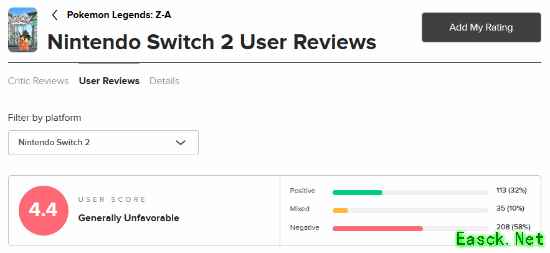 《宝可梦传说:Z-A》现已正式在Switch 2与Switch平台发售,游戏的舞台是以人与宝可梦共存的城市为目标,推进都市再开发的“密阿雷市”。这里以人与宝可梦共存为目标,大力推进都市再开发,全新的冒险将会在此展开。 《宝可梦传说:Z-A》的M站玩家评分已经解禁,截至发稿前为4.4分(Switch 2版),其中好评率为32%,中评率为10%,差评率为58%。Switch版为4.0分,其中好评率为27%,中评率为4%,差评率为69%。 点击查看MetaCritic实时评分>>> 部分给出好评的玩家认为《宝可梦传说:Z-A》的性能表现十分出色,战斗机制十分有趣;给出中评的玩家认为《宝可梦传说:Z-A》的总体趣味性不足;给出差评的玩家认为《宝可梦传说:Z-A》的画面非常糟糕,玩法很是无聊,且有着一些Bug。 屏幕前的你玩《宝可梦传说:Z-A》了吗?会为它打多少分?一起在评论区聊聊吧! 本文由制作发布,未经允许禁止转载。 话题投票投 票查 看更多相关资讯请关注:宝可梦传说:Z-A专区 |