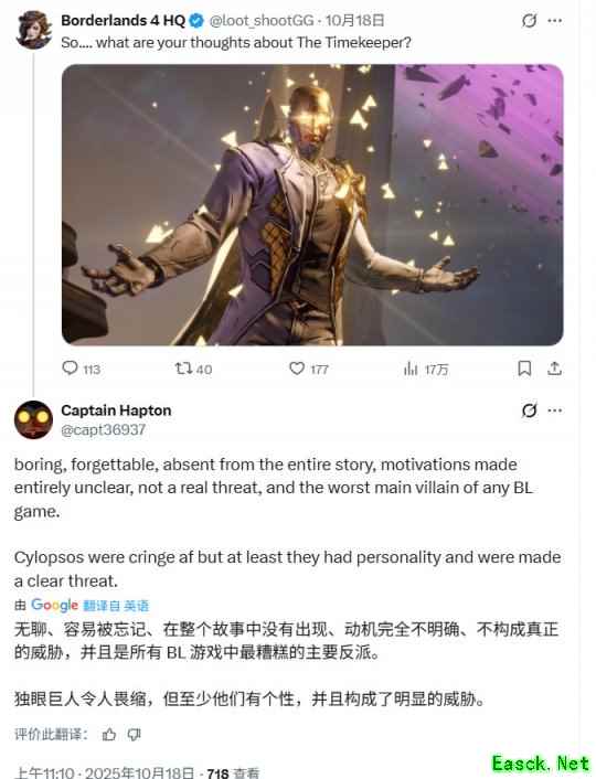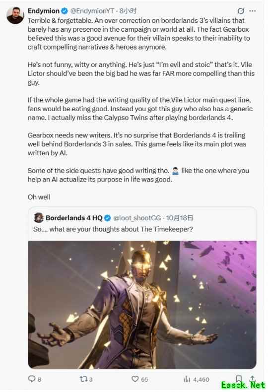《无主之地4》仅仅发售一个多月,PC Steam版玩家暴跌85%,眼看后续的销售没有了动力,2K想到了降价促销,但这一来,让不少首发玩家感觉到了背刺,开始在Steam版打出差评。 此外,《无主之地4》也在海外社交媒体上引起了大量批评。事情起因是一条询问“你怎么评价《无主之地4》大反派时间尊者”的推文,评论区很多玩家留言,指出这个终极Boss设计地非常失败,没有自己的特色,甚至不如《无主之地3》中的兄妹反派。 一名玩家留言说:“他们(Gearbox)从3代纠往过正了。把反派从一个话痨变成了一个几乎没有什么存在感的人,你很少会注意到他和你的互动,他给玩家只是留下了讨厌混乱这种印象,除此之外没有任何自己的个性。” 也有玩家发表了类似的看法,称其“无聊,容易被遗忘,在整个故事中没有出现、动机完全不明确、不构成真正的威胁,并且是所有《无主之地》游戏中最糟糕的反派。” 用户@EndymionYT更是借此机会批评了《无主之地4》的剧情,简直就像是AI写的: “糟糕且令人遗忘。相比《无主之地3》的反派,这次完全是矫枉过正——在整个战役和世界中几乎没有任何存在感。Gearbox竟然认为这是塑造反派的正确方向,足以说明他们已经完全失去了创造引人入胜的剧情与英雄的能力。 他既不搞笑,也不机智,什么都不是。就只是个“我很邪恶而且很冷漠”的角色,仅此而已。反倒是“卑鄙执政官”(Vile Lictor)才该当最终BOSS——他比这家伙有趣得多、令人印象深刻得多。 如果整款游戏的写作水平都能像“卑鄙执政官”主线任务那样高,玩家早就乐开花了。结果你得到的却是这个毫无个性的家伙,连名字都俗套得要命。玩完《无主之地4》后,我居然开始怀念卡吕普索双胞胎了。 Gearbox真的该换一批编剧。难怪《无主之地4》的销量远远落后于《无主之地3》。这游戏的主线剧情感觉就像是AI写的。 不过一些支线任务的写作确实不错?,比如那个帮助AI寻找生命意义的任务就写得很好。” 《无主之地4》的剧情暴雷早有预警,早在此前的幕后制作视频中,其染成绿发的叙事总监Lin Joyce就已经很令人担忧: 近期的Steam评价: |
