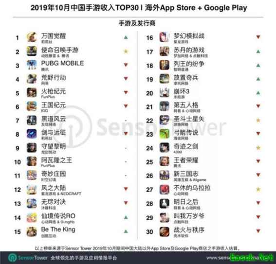 作为率先出海的国产游戏,《万国觉醒》的海外成绩也是相当出彩,在权威数据机构SensorTower统计的中国手游Google Play(安卓)+App Store(iOS)双平台收入榜上,当时刚刚问世不久的《万国觉醒》便成功登上榜首,力压鹅厂实力之作《使命召唤手游》和《PUBG MOBILE》,一款SLG能够超过FPS和吃鸡游戏位居首席,这在以前或许想都不敢想!