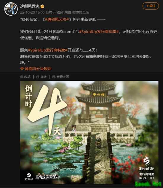 像素武侠RPG《逸剑风云决》官方宣布将于10月24日参与Steam平台SpiralUp发行商特卖,届时将打出七五折史低优惠。 作为参考,《逸剑风云决》国区原价78元,史低62.4元(八折),这次特卖预计优惠后为58.5元。 《逸剑风云决》是一款像素武侠RPG。玩家将扮演一名来自关外辽城的普通少年,因意外卷入江湖纷争而身中剧毒,幸得武当掌门清虚真人出手才得救。游戏发售两年多,Steam累计收录2.7万玩家评测,好评率94%(特别好评)。 游戏特色: 沉浸式体验经典武侠的江湖世界,不同的选择也会改变最终剧情。游戏提供了200多条主支线剧情,许多意想不到的奇遇与隐藏剧情等待玩家发现。 独特3D像素风将传统的像素画面切入3D场景之中,使二者进行了有机融合。 不同门派自由搭配不同武器。学习内功可以增加玩家经脉点数,内外兼修使你成为一代武林高手。 游戏中的大部分NPC都有好感度系统,你可以通过送礼切磋请教等交互方式,提高NPC友好度,并让他们成为你的队友来共闯江湖。每个不同的门派NPC有不同的江湖技能,若关系交好,他们还会将自身的神兵秘笈相送,助你称霸武林,在江湖上八面玲珑。 游戏内有近百张地图供玩家探索,关外、天山、中原等等……不同区域将有全然不同的天气与地貌。 本文由制作发布,未经允许禁止转载。 更多相关资讯请关注:逸剑风云决专区 |