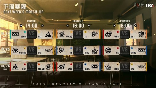 【当前战况】 2025IVL秋季赛第三周的比赛已经结束,当前积分排名如图: ![]() 【本周精彩回顾】 第一天,成都Wolves vs FPX.ZQ第三局下半场来到红教堂,FPX.ZQ_DongX“使徒”开局追击小木屋的Wolves_tian教授,Wolves_tian提前拉点转入大房,中场Wolves_Jelly拉拉队员密码机已被干扰,遂见缝插针为教授叠上激励,Wolves_tian利用两次激励加速继续与监管者保持安全身距,在大房长窗区与“使徒”进行博弈,期间拉拉队员在旁不断叠激励层数。待Wolves_tian转点入小木屋的时候,激励层数已经成功来到28层,FPX.ZQ_DongX及时使用恫吓使拉拉队员沉默,教授身上的激励层数也在此期间消退,但Wolves_487勘探员机子破译完毕后,如及时雨般火速赶来接力保护教授,队友纷至沓来的帮助对于监管者来说一时间有些应接不暇,见此情景,FPX.ZQ_DongX只好选择换追拉拉队员,被迫闪现开刀。但拉拉队员手中两层鼓舞使监管者很难利用猫步快速跟上,且Wolves_487勘探员还在中场随时待命,用磁铁吸引监管者,成功让Wolves_Jelly拉拉队员翻窗再次转点进入小木屋。待“使徒”的爱猫咬住拉拉队员即将被眩晕的时候,Wolves_487眼疾手快抛出磁铁,弹开监管者;在监管者追击拉拉队员的必经之路上截辕杜辔,利用磁控法则将“使徒”远程拉回并造成眩晕,功成身退后去破译最后一台密码机,将战场留给拉拉队员和即将救援的佣兵发挥。FPX.ZQ_DongX挂上拉拉队员后,选择直接去管控密码机,同时放手一搏赌勘探员没有携带回光返照以此来作为开门战的切入点,但一切都按照求生者方的节奏忙不迭地进行着,Wolves_XMX顺利将勘探员救下并在规避闪现之后快速使用护臂拉开距离奔向小门。整个对局成都Wolves求生者群策群力,一狼呼群狼至,完成一场畅快的四跑! ![]() 图为Wolves_487利用磁铁远程拉回监管者并对其造成眩晕 MRC vs ACT第二局下半场,在月亮河公园ACT_Xmiao5飞行家在终点站合理使用飞行器围绕两板一窗和站台双板稳健牵制,并及时砸板延长自己的牵制时间。ACT_Eleven大副利用海神怀表周旋于狂欢之椅附近,最大化利用了飞行家的淘汰时间,无伤将人救下。MRC_BaiLu再次挂上飞行家后,利用通缉隔墙使用分身将大副状态打下并将最后的海神怀表逼出,使求生者被迫卖掉飞行家。MRC_BaiLu趁热打铁,直接利用移形去管控三站下密码机,但ACT_xy古董商还是先一步把密码机抢亮。面对满道具的古董商起追击节奏较为低效,MRC_BaiLu选择继续去追击半状态没道具的大副。眼看大副能被挂回遗产机,ACT_xy古董商先在外围重启密码机,ACT_Gougou火灾调查员准备进行救援并在人皇桥上破译遗产机给压力,MRC_BaiLu放下大副前去压制火灾调查员,古董商也及时参与到战场中来,三人围绕最后一台大遗产机进行拉扯。最终人皇桥上密码机压好,古董商将人救下进入开门战阶段。“喧嚣”利用焰火舞台封锁古董商技能,分身双球触发伤害快速击倒古董商,ACT_Eleven大副预判监管者会移形排查终点站,躲避监管者的锐气,蛰伏在马戏团最深处的角落并不急于救人,极限卡在监管者耳鸣之外,杀监管者心理上的一个回马枪,使其误判大副已经向起点站大门赶去;待监管者排到马戏团附近的时候,大副来到了已经被排查过的小门开始点门,最终成功逃脱达成平局,完成了一场以暗击明以逸待劳,信息差对阵高机动性、心理博弈上的智斗。 ![]() 图为ACT_Eleven大副巧妙走位使监管者未能侦破其行踪 第三天,成都Wolves vs Gr第二局下半场,Gr_Jin再次展现追击流监管者的暴力美学,开局Gr_Jin进入鬼屋准备追击Wolves _Jelly杂技演员,极速影跃贴近身位,在杂技演员跳跃一瞬间出刀,开局14秒便成功拿到第一刀伤害,杂技演员欲进入长板牵制,但Gr_Jin不断压制身位不让其贴近板子有博弈空间,开局24秒便击倒杂技演员并挂往地下室,打破本赛季最快击倒记录。Gr_Jin已知大副前来救人的方向,提前出击,将Wolves _XMX在还未进入鬼屋时便将其海神怀表第一段逼出,面对这个易守难攻的地下室,Wolves _XMX顶住压力灵活走位,在狭窄地形也能规避监管者出刀,成功进入地下室极限将人救下。但因杂技演员在化险为夷期间绕路走位浪费太多时间,导致不能及时拉离并再次被挂回地下室,Wolves _487空军前来二次救援,Gr_Jin利用出刀的前后摇僵直故意卖出破绽,引诱对方开枪并成功后撤步躲避,且Wolves _487博弈时间太久,没有注意淘汰进度,最终未能进入地下室并被打下状态,被Gr_Jin闪现落地击倒。再一次的地下室上挂使求生者整个局势积重难返,进入慢性死亡。但值得一提的是,Wolves _tian在后期展现出了稳健的牵制能力,交道具的时机恰如其分,板间博弈干净利落,面对二阶歌剧演员成功牵制70秒,实在是后生可畏。通过本局的交战,Gr_Jin也成为本赛季首位淘汰人数达50次的选手,恭喜Gr_Jin! ![]() 图为Gr_Jin利用墙体躲避信号枪 MRC vs 北京WBG第二局下半场,WBG_N1e歌剧演员于红教堂墓地向中场进发,准备追击MRC_HuaC病患,MRC_HuaC使用钩爪穿过大房靠近小木屋窗户进行转点,WBG_N1e歌剧演员熟练度很高,从大房外围快速贴近,在下一个钩爪好之前对病患造成伤害,病患转点至小门板区,并利用钩爪突破残影包围,合理利用膝跳弹射进入两板一窗区,WBG_N1e顺路对MRC_Nanako密码机进行失常,把控场上密码机进度,最终在墓地将病患击倒。因己方积分优势,只需逃脱一个便可以赢下比赛,求生者方选择只救一次后将病患卖掉。WBG_N1e选择从MRC_XiaoD入殓师开启下一波节奏