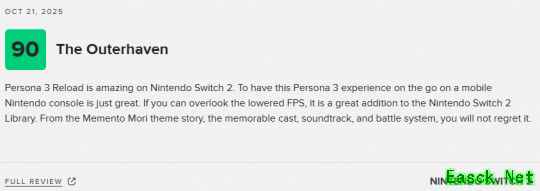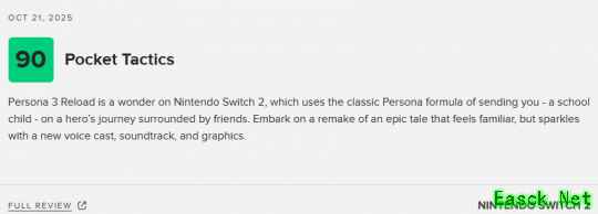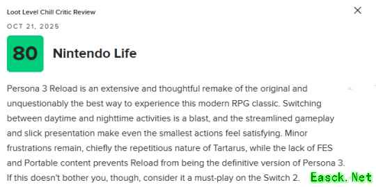 由Atlus开发的日式rpg《女神异闻录3:Reload》即将登陆Switch2平台。本作的Switch2版媒体评测已经正式公开,截止发稿前,本作NS2版本的均分为79分,共收录22家媒体。 以下为部分媒体评价: Pocket Tactics?90分: 《女神异闻录3:Reload》在Nintendo Switch 2上表现出色,延续了系列经典模式——让玩家扮演一名普通学生,在友情与羁绊的陪伴下踏上英雄旅程。这部重制版带来了熟悉却焕然一新的史诗故事,全新的配音阵容、音乐与画面为其注入了全新的生命力。 The Outerhaven?90分: 《女神异闻录3:Reload》在Nintendo Switch 2上的表现令人惊艳。能够在这款便携主机上随时随地体验《女神异闻录3》的完整旅程,本身就是一种享受。尽管帧率略有下降,但整体表现依然出色,足以成为Switch 2游戏阵容中的亮点之一。无论是以“死亡必至”为核心的主题故事,令人难忘的角色阵容,还是经典的配乐与战斗系统,都让这次体验物超所值。 Loot Level Chill?85分: 虽然移植表现略显遗憾,但《女神异闻录3:Reload》在Switch2上依然是2025年最值得游玩的RPG之一。 Nintendo Life 80分: 《女神异闻录3:Reload》是一款内容丰富且用心重制的作品,无疑是体验这款现代RPG经典的最佳方式。白天与夜晚之间的生活切换依然充满乐趣,精简的玩法设计与流畅的演出表现,让每一个细微动作都充满满足感。虽然游戏仍存在些许不足——塔尔塔洛斯部分略显重复,同时缺少FES与Portable版内容使其未能成为最完整的《女神异闻录3》版本——但如果你能接受这些小遗憾,这部作品依然是Nintendo Switch 2平台上不可错过的必玩之作。 |