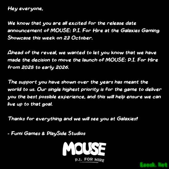 10月22日,《神探杰克鼠》官方推特发文表示,游戏将延期至2026年初发布,并对此深感抱歉。