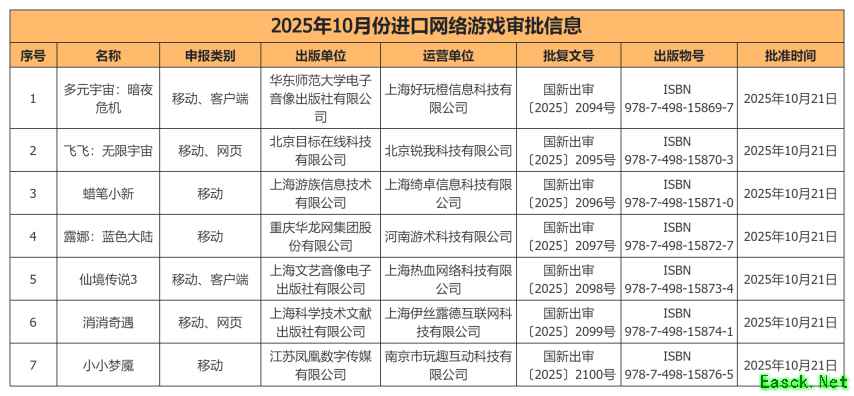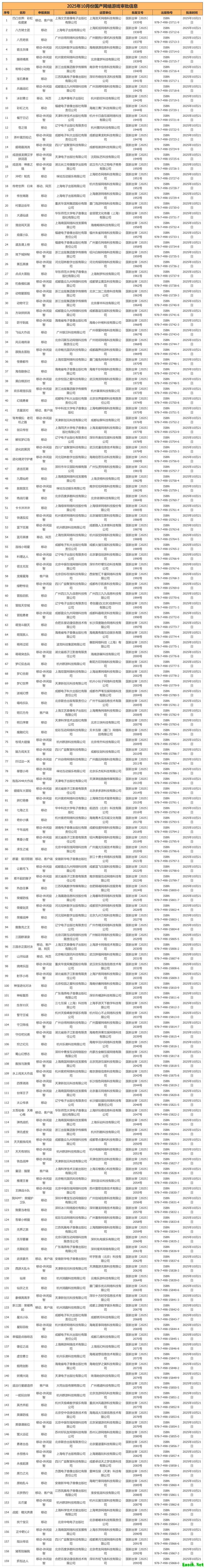 近日,国家新闻出版署公布了10月游戏版号审批情况,总计159款国产游戏、7款进口游戏过审,7款游戏变更信息。 其中有多款重点产品过审,鹰角客户端游戏《明日方舟》、上海好玩橙《太吾绘卷:天幕心帷》、游卡《三国杀正面对决》、中青宝《我叫MT:荣耀护卫队》、4399《冒险启航》、战火互娱《英雄防线》包括等。