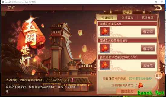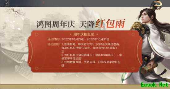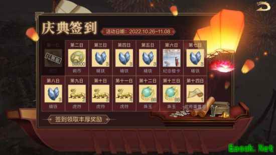 活动时间: 10月28日-10月31日,每日12时、20时 活动内容: 红包雨每日准时降落!活动期间,每日12时和20时,将有红包雨从天而降,红包数量有限,还请主公们提前蹲点哟~ 活动奖励: 抢红包玩家可获得珠玉(最高1888)、中领军等丰厚奖励。 三、玉阙萤灯 玉阙连鸿图,庆典燃萤灯。