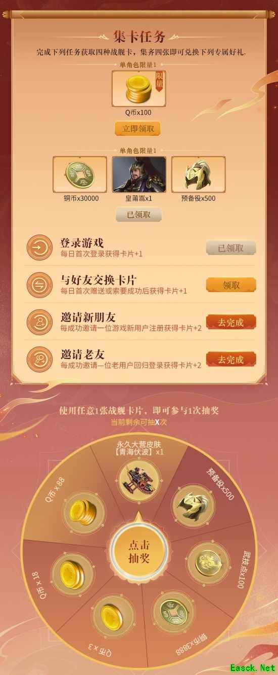活动时间: 10月28日-11月10日 活动内容: 前往活动页面完成每日登录任务、交换卡牌及邀请好友任务,即可收集战舰卡,兑换或抽取多重豪礼! 活动奖励: 集卡可兑换100元现金/企鹅币、黄埔嵩等奖励;抽奖将有机会获得永久大营皮肤【青海伏波】以及多重现金/企鹅币奖励! 10月26日,鸿图之下双周年庆典开启,九大活动等你参与,无数丰厚奖励等你来领取!还望主公们前来共庆双周年,小编在此恭候诸位大驾! |