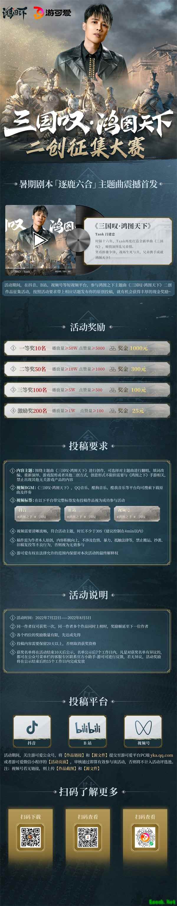 主公们好!《鸿图之下》新剧本【逐鹿六合】的主题曲正式发布以来,看到有不少主公们跃跃欲试想要对这首歌进行翻唱,于是本次征集活动应运而生——《三国叹·鸿图天下》二创征集大赛已经开启! 在为时两周的赛期中,主公们可围绕主题曲《三国叹·鸿图天下》进行创作,创作内容形式包括但不限于:翻唱、填词改编、游戏混剪等,参与活动将有机会得到千元现金奖励!好的才华不应被埋没,好机会不容错过,还请诸位积极参与! 具体投稿要求以及活动奖励请见下图。