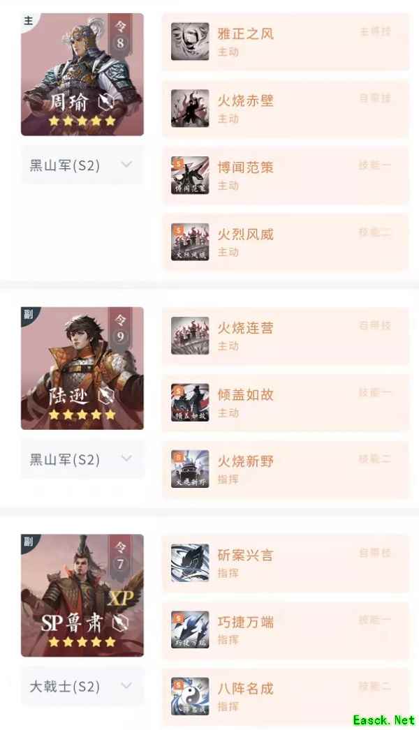 陆逊的输出核心依旧为火烧连营,副输出推荐倾盖如故+火烧新野,主要用于1速替周瑜打火属性增益,配合火烧新野触发额外伤害,虽然倾盖如故在一定程度上会干扰博闻复制连营,但该技能提供的增益能整体拔高周瑜的输出伤害,比连营触发更具价值。 技能配置03——鲁肃