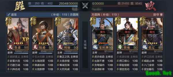 该体系中仍然需要周瑜主将技的前置焚烧,所以SP鲁肃的定位为辅助,推荐巧捷万端+八阵名成,前者配合队内高频的主动技能释放叠加增伤并对敌减伤,后者保证己方开场优势,可以根据PVP环境更换为画地为牢、空城计等控场技能。 实战效果 测试中我们选用当下的热门阵容,为了保证对战的真实性,并未刻意调整敌我双方的属性加点与技能配置,并且全部处于晴天、雪天等无火属性增益天气。 经过测试可以看出,由于队伍中八阵名成前期强势的困敌效果,敌方核武几乎被限制至死,副将被巧捷万端削弱伤害后,也无法造成有效的输出,而我方凭借高频AOE爆发,均以低损取胜。但都督队由于武将属性成长限制,无法进行属性调整,必定被空城计克制,主公们在使用该阵容时需要尽量避开带空城的队伍,大风天出战优势更佳。