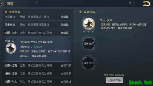 气候:季节交替,气象之力尽在掌控! ”水淹七军“年度剧本中,《鸿图之下》对天气系统进行全面革新,新增雨季(下雨机率提升)、旱季(下雨机率减少)两种季节设定 。季节的更替随赛季阶段的推进而变化,随机出现雨天、晴天、风天、雾天等天气。不过,虽然天气的出现几率受季节影响,但联盟占领资源州郡后,便可”逆天改命“,通过进行唤雨、祈晴等行为,强行更改天气为雨天或晴天,从而进一步掌控战局。 另外值得注意的是,雨天将会在新剧本中大量出现,对甘宁等主打天气联动的武将提升显著。把握这一诀窍,定会让主公们的赛季征战事半功倍!