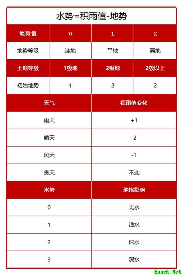 地形:沙盘改造,天时地利为我所用! 天气的变化会对战斗产生哪些影响?最直观的影响便是会改变地格水势。地格水势受地势、天气变化影响,分为洼地、平地、高地。不同地势与不同天气的积雨值(下雨量)互相影响,形成地格最终的无水、浅水、深水等水势。如下图所示,水势=积水-地势。在敌人连续降雨,意图趁我方持续处于积水损益状态一举击溃时,主公们可以通过挖掘、填平改变地格地势,从而影响地格水势,打乱敌人的战略部署。